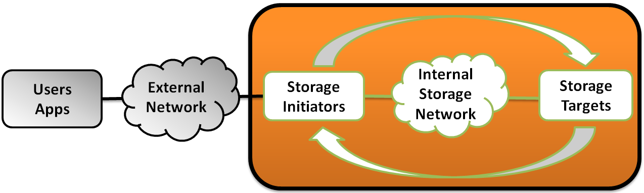 The fact that the workload is steady means that whatever is transpiring over the black link connecting the orange blob with external world has fixed characteristics, throughput and latency wise. It is as if the lower parts (layers) of the apps – those that produce and consume I/Os – execute directly inside storage initiators without taking any resources. The I/Os get generated at application-defined rates and distributed across the cluster, with subsequent interactions over Internal Storage Network.