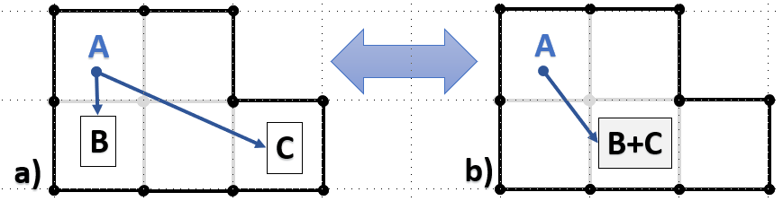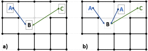 Next, compare the following two scenarios where node B is referenced in the World grid by two other nodes: A and C.