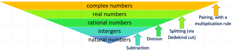 In the picture above integers can be derived from the natural numbers via subtraction, rational numbers from integers – via division, real numbers from rational numbers – via a Dedekind cut, and complex numbers from real numbers – via the pairing of real numbers and defining the multiplication rule as follows: