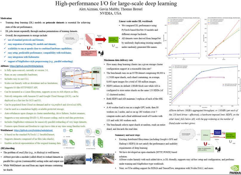 Abstract – Training deep learning (DL) models on petascale datasets is essential for achieving competitive and state-of-the-art performance in applications such as speech, video analytics, and object recognition. However, existing distributed filesystems were not developed for the access patterns and usability requirements of DL jobs. In this paper, we describe AIStore, a highly scalable, easy-to-deploy storage system, and WebDataset, a standards-based storage format and library that permits efficient access to very large datasets. We compare system performance experimentally using image classification workloads and storing training data on a variety of backends, including local SSDs, single-node NFS, and two identical bare-metal clusters: HDFS and AIStore (in Proc. of IEEE International Conference on Big Data 2019).